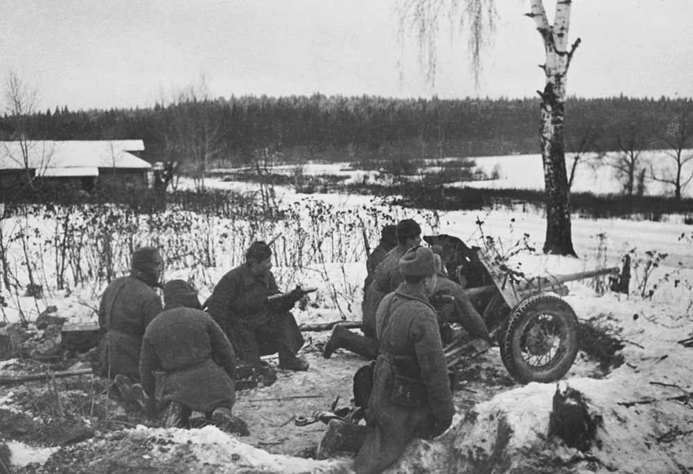 Расчёт 45-мм противотанковой пушки 53-К на окраине деревни под Москвой, декабрь 1941 года