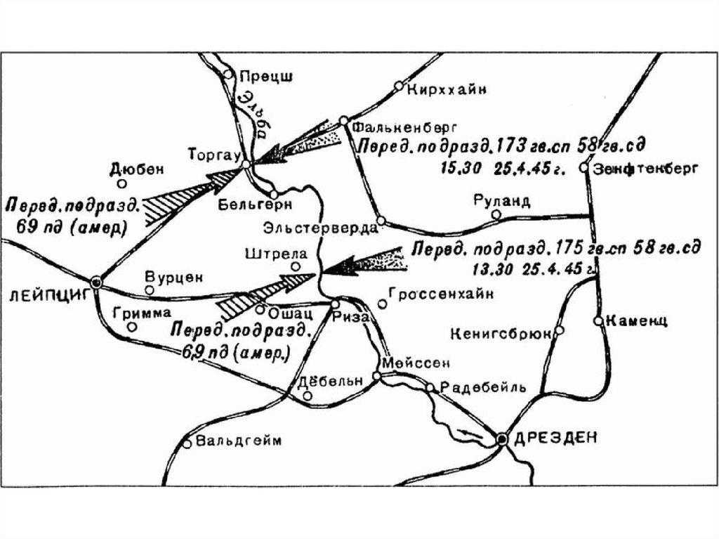 Интересно, что на пару часов раньше уже произошла встреча на Эльбе, чуть южнее. В 13:30, неподалёку от города Риза, бойцы старшего лейтенанта Голобородько Григория Степановича встретились на «своём» берегу с американской разведгруппой под командованием первого лейтенанта Альберта Коцебу.