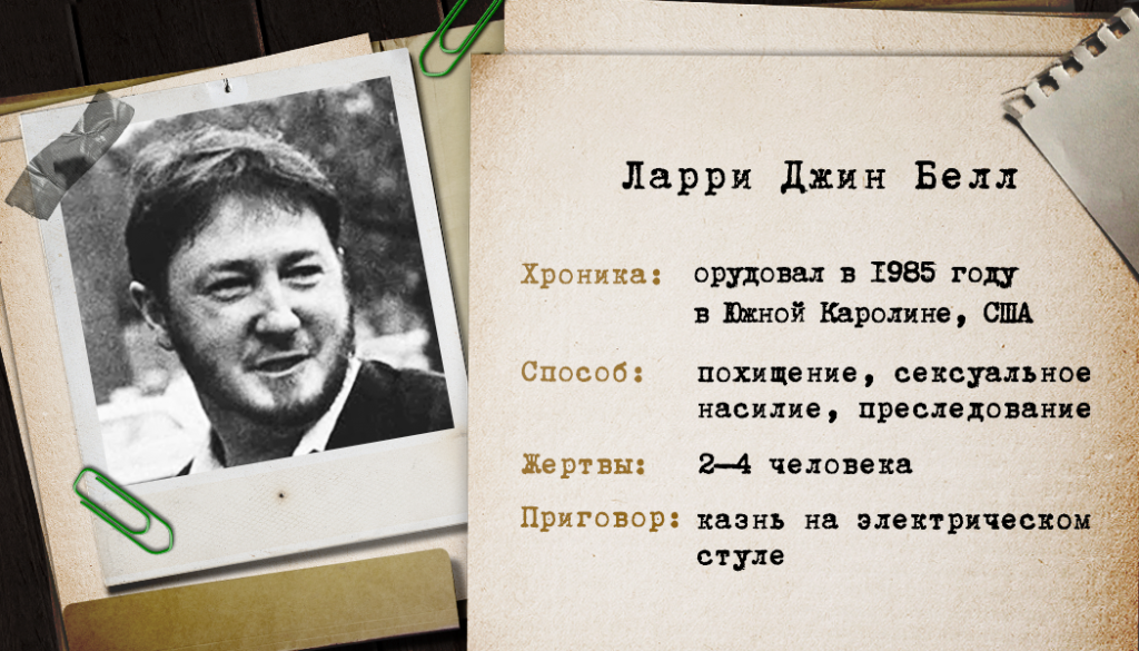 Кровожадные убийцы упиваются своей властью над жертвами. Сексуальный маньяк Ларри Джин Белл пошел дальше. Ему мало было похитить, изнасиловать и убить двух девочек-подростков. Он терроризировал их семьи по телефону, засыпал письмами с угрозами. Это в итоге и помогло задержать убийцу. Следователи подозревали его причастность еще к двум исчезновениям в Южной Каролине, но Белл не признался.