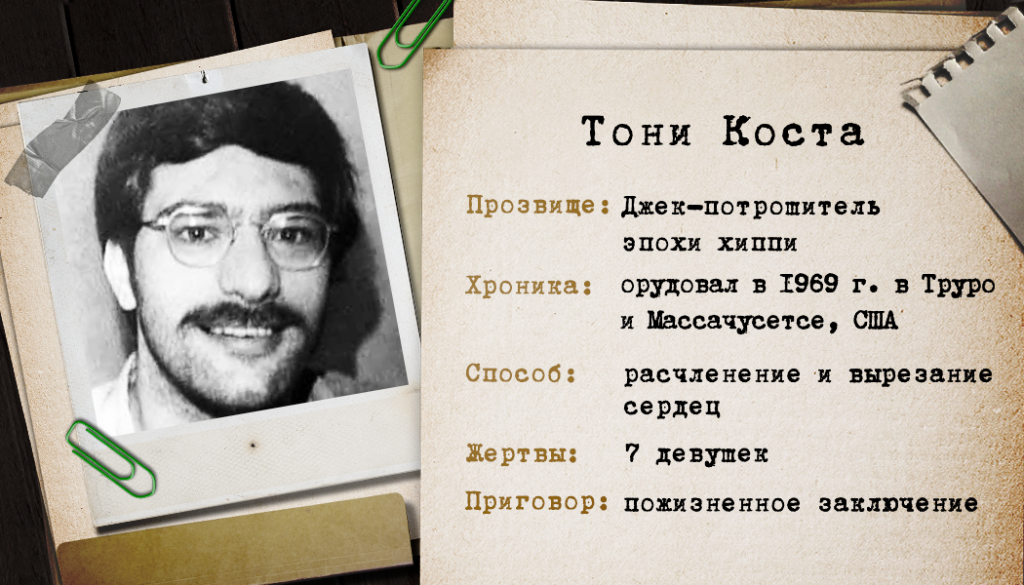 1960-е в Америке – эпоха свободной любви, разгула наркотиков и хиппи. Джеком-потрошителем этого времени стал Тони Коста (настоящее имя – Энтони Чарльз Коста). Интересно, что такое прозвище дал серийному убийце и маньяку писатель Курт Воннегут. Его дочь Эдит была знакома с Тони, а Воннегут с ним переписывался: «Смысл его писем ко мне заключался в том, что человек, столь стремящийся быть добродетельным, как он, не смог бы и мухи обидеть. Он в это верил». Косту судили по обвинению в семи убийствах, но доказать удалось только два.