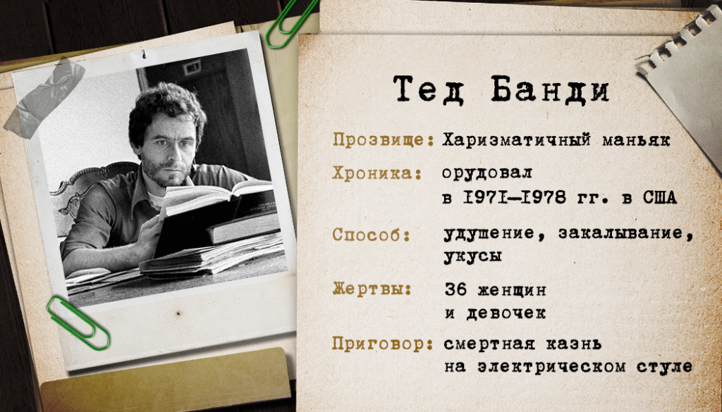Банди пользовался огромным успехом у женщин, изучал китайский язык, психологию и юриспруденцию, работал на тогдашнего губернатора Вашингтона Эванса – мог добиться высот. Но он выбрал путь серийного маньяка и убийцы. Точно неизвестно, когда он начал убивать, то ли в 14 лет, то ли в 27. Он колесил по разным штатам от Вашингтона до Юты, совершая злодейства. Однажды его остановила дорожно-патрульная служба. При обыске машины нашли маску из колготок, ледоруб, наручники, веревки, мусорные пакеты, но Банди сумел убедить постовых, что это бытовые предметы и никакой опасности не представляют.