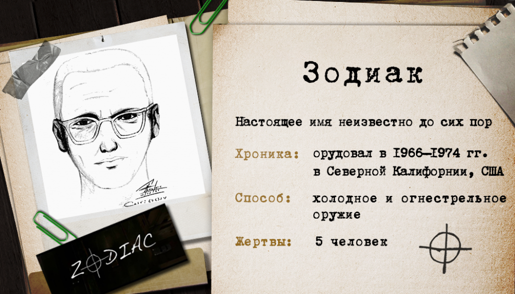 Неустановленный преступник нападал на влюбленные пары, уединившиеся в автомобилях, в городах Северной Калифорнии. Второе убийство сопровождало письмо, в котором был шифр и подпись Зодиак с кельтским крестом. Этот же знак нашли на одном из мест преступлений. До 1974 года приходили такие послания, их достоверность фактически подтверждена, в отличии от тех писем, что присылали позже.