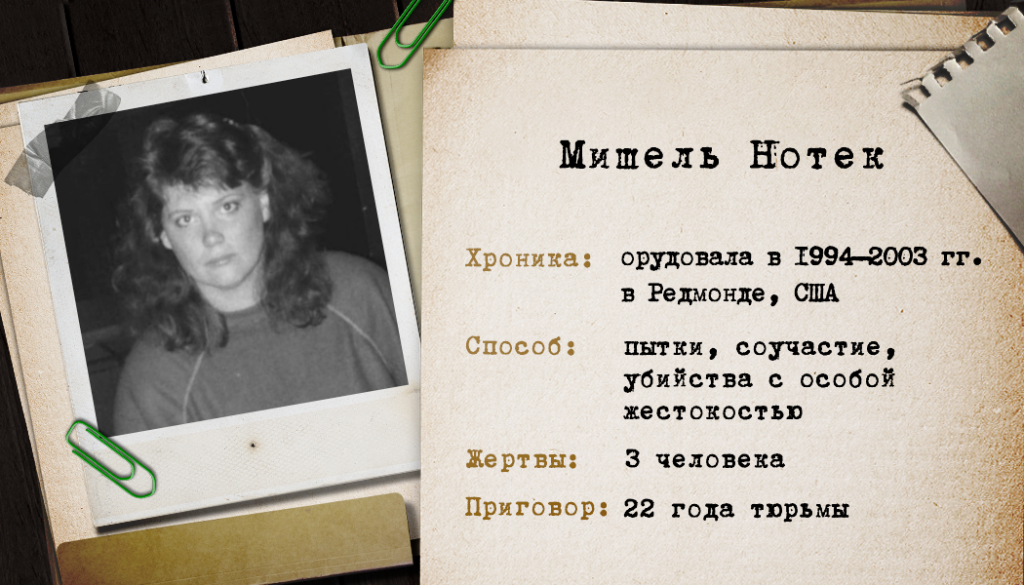 Серийные убийцы-женщины встречаются реже, но в жестокости превосходят мужчин. Такой была Мишель Нотек. Вместе с мужем она годами пытала (оставляла надолго без еды, заставляла калечиться, заливала ссадины отбеливателем) и впоследствии убила двоих людей, причем не случайных незнакомцев, а постояльцев их дома. Там же прямо на глазах у трех дочерей – Никки, Сэми, Тори – творились все эти ужасы. Третьей жертвой стал племянник Мишель, которого застрелил ее муж. Женщина проходила по этому делу соучастницей.