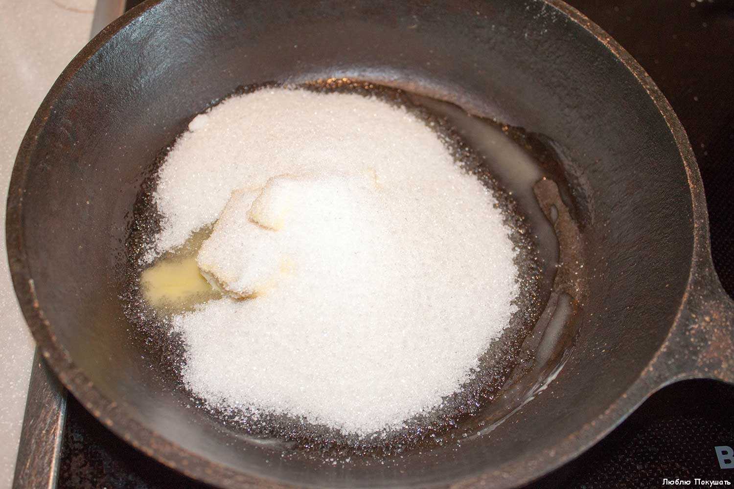 В чугунной сковороде растопите сливочное масло и коричневый сахар вместе.
