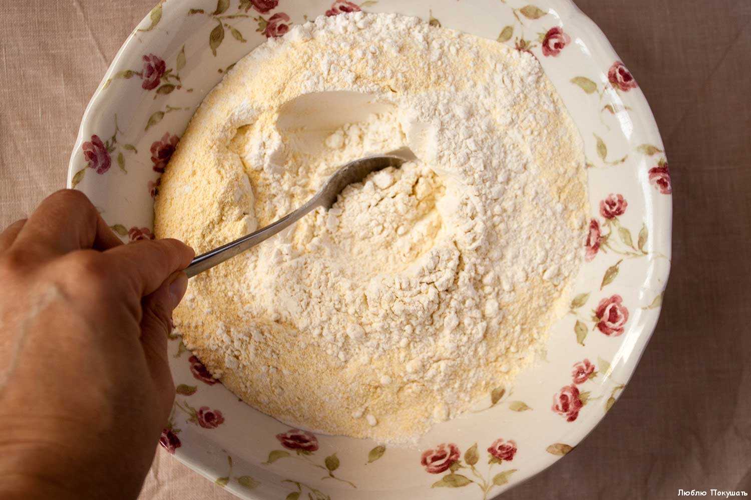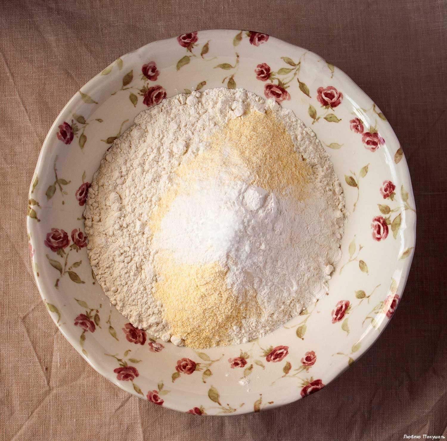 В отдельной миске, размешайте вместе муку, кукурузную муку, пекарский порошок и соль.