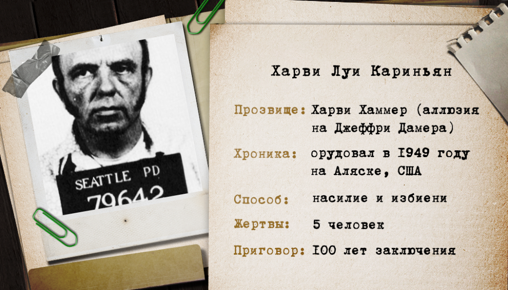 Ему приписывают 50 жертв, но признал он только пять. Не обладая харизмой Банди, он выбирал тех, кто нуждался в помощи, предлагал подвезти, например, а потом совершал надругательства и избивал. Кариньян провел в тюрьме 48 лет и имеет право на УДО, ведь в Миннесоте никто не сидит в тюрьме больше 45 лет.