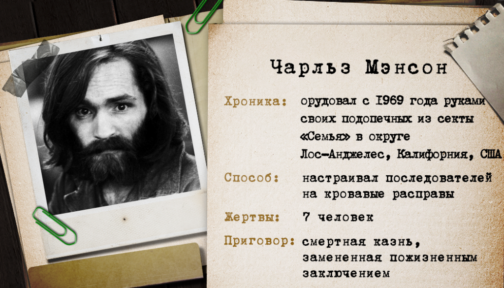 В 33 года после очередной отсидки, он подружился с местными хиппи и сделал их сектой, которую именовал «Семья». Мэнсон пропагандировал идеи приближения межрасовой войны. Он признавался, что вдохновился песней Helter Skelter группы The Beatles. А чтобы развязать ту самую войну, Мэнсону нужно было совершить убийства состоятельных белых людей и свалить вину на афроамериканцев. Первое и самое громкое преступление случилось в 1969-м в доме Романа Полански. Знаменитого режиссера дома не оказалось, но последователи Мэнсона расправились с его беременной женой, актрисой Шэрон Тейт, и четырьмя ее гостями. На следующий же день случилось новое преступление. На этот раз погибла семейная пара, а сам Мэнсон участвовал в расправе. На стенах они кровью написали: «Смерть свиньям», «Восстание» и «Хелтер-скелтер». Взять основателя секты и его приспешников удалось, после того как одна из подопечных разболталась в ходе ареста по другому делу. Чарльз провел в тюрьме 45 лет, 12 раз подавал заявления на условно-досрочное освобождение, но ему отказывали. Он умер в 2017 году от сердечной недостаточности.