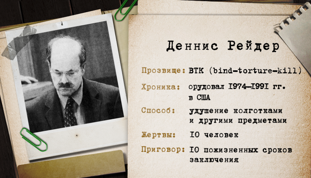 В 1974 году он совершил свое первое массовое убийство: влез в дом и лишил жизни семью из четырех человек. Какой-то неизвестный заключенный вскоре присвоил себе его деяние. Из новостей Рейдер об этом узнал и рассвирепел. Он жаждал внимания и признания, поэтому после каждого преступления стал отправлять в полицию анонимки с деталями, которые мог знать только виновный. Подписывал письма BTK: от английских глаголов bind – связать, torture – пытать, kill – убить.