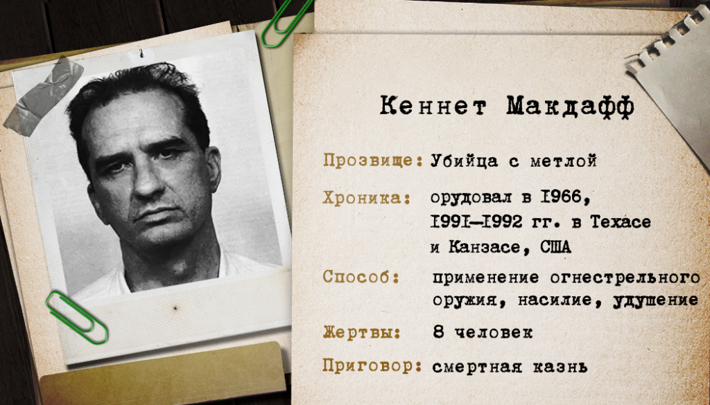 Когда Кеннету было 20 лет, он вместе с приятелем Роем Грином подстерег на улице троих подростков: 16-летнюю Эдну и двух ее друзей. Под дулом пистолета они запихнули ребят в багажник и увезли в поле. Там Кеннет убил парней. Девушку они с Грином насиловали, а потом Макдафф ее задушил.