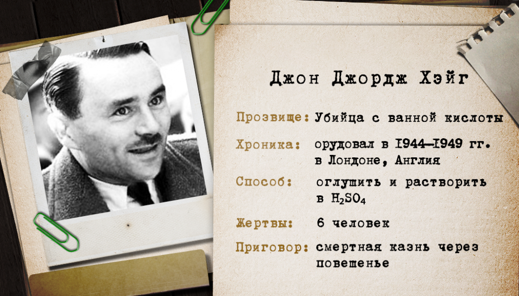 Сказать, что у него было трудное детство и какие-то страшные события повлияли на его психику, нельзя. Он был поздним, единственным и горячо любимым сыном, чем и пользовался. От подделывания подписей учителей он перешел к более крупным обманам, а потом и убийствам. Более подробно можно послушать в выпуске «Лондонский вампир» шоу «Дневники Лоры Палны» Мити Лебедева и Маши Погребняк. Кстати, идею, как избавляться от тел, образованный Хэйг почерпнул из романа Оскара Уайльда «Портрет Дориана Грея».