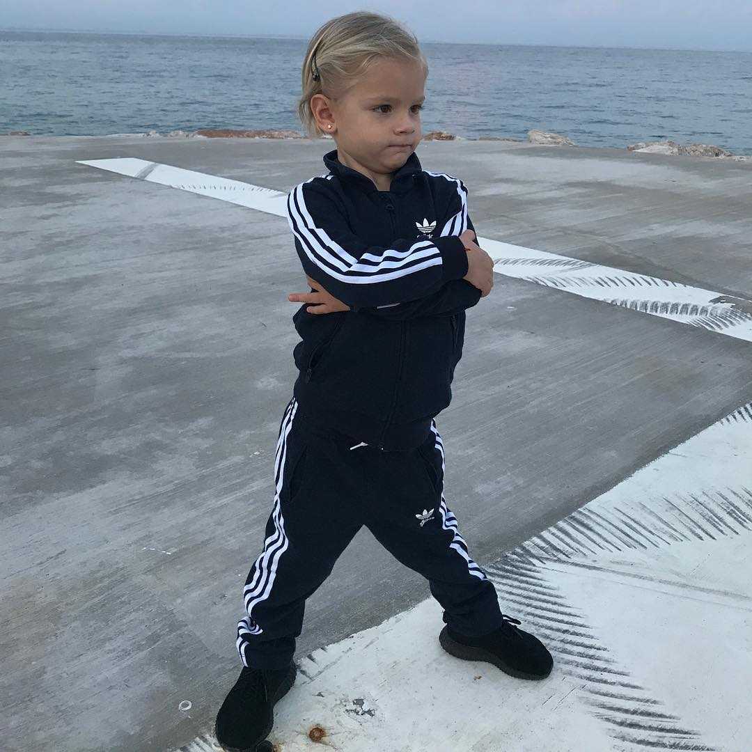 Вот еще один «спортивный look», представленный маленькой Тимуровной: черный костюм и кроссовки от Канье Уэста. Между прочим, так одеваются многие голливудские звёзды, которых считают настоящими законодателями моды.